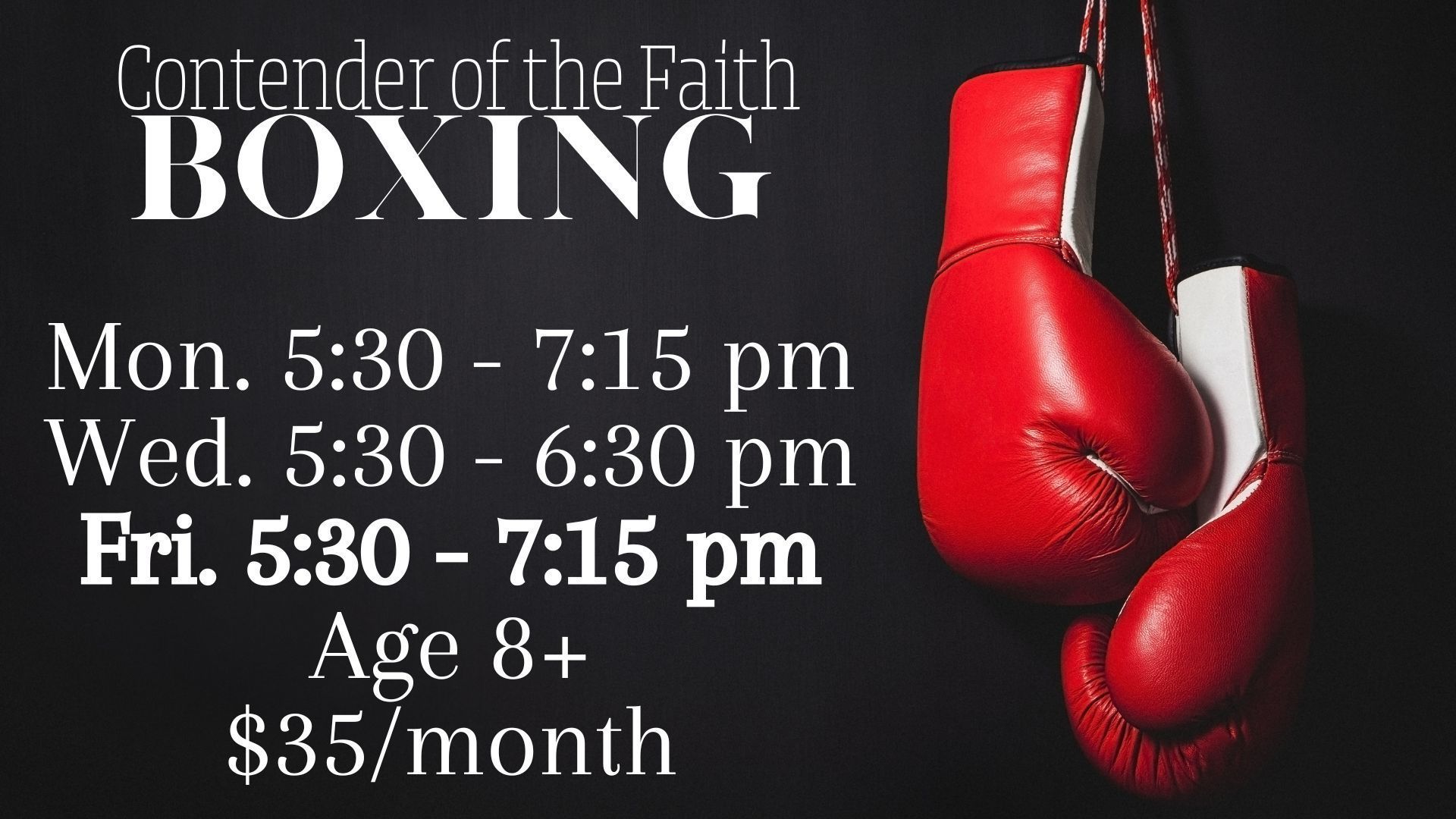 Our Wednesday nights kicks off with a free family dinner from 5:30-6:15pm in Fellowship Hall. We have an Adult Bible Study lead by Pastor Jim from 6:15-7:15pm. We also have Centershot for ages 5 through 6th grade, Youth Group for 7th grade and up as well as our Contenders of the Faith Boxing program! Click the button below for more info!